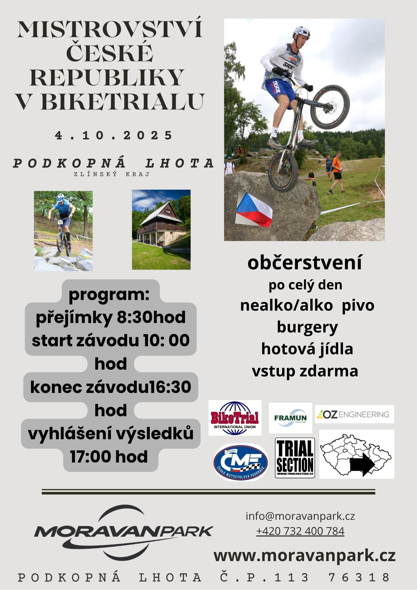 Vážení občané, v sobotu 4.10.2025 se v areálu MORAVANPARKU (Podkopná Lhota 113) uskuteční Mistrovství České republiky v BIKETRIALU.
